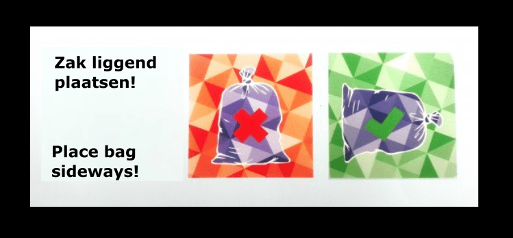 Is bovenstaand je goed bevallen, en zit een andere zak ook klem, geef die dan meteen ook een duwtje mee. Als we hier allemaal op letten benutten we in ieder geval de inhoud van de containers veel beter, en verminderen we de overlast aanzienlijk.