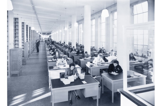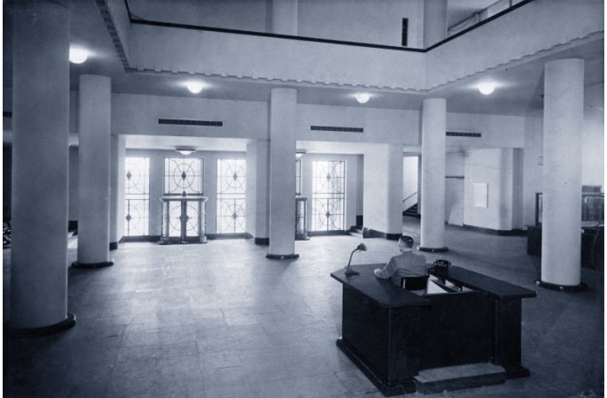In de periode dat het pand als belastingkantoor fungeert, werken circa 800 mensen in het pand. Bij binnenkomst staat er slechts een bureau in de hal. Daar zit de portier die de bezoekers naar de juiste afdelingen verwijst. Op de onderste verdiepingen aan de voorzijde zitten de belangrijkste diensten en medewerkers, met de mooist ingerichte kantoren. Op de bovenste verdiepingen wordt gewerkt in grote open ruimten die de gehele lengte van de vleugel beslaan. Alle bureaus zijn in lange rijen opgesteld en er mag niet gepraat worden. Elke afdeling heeft zijn eigen toezichthouder die zijn collega’s hierop moet controleren. Het pand wordt jaarlijks druk bezocht omdat alle Rotterdammers hun belastingen persoonlijk contant moeten afrekenen.