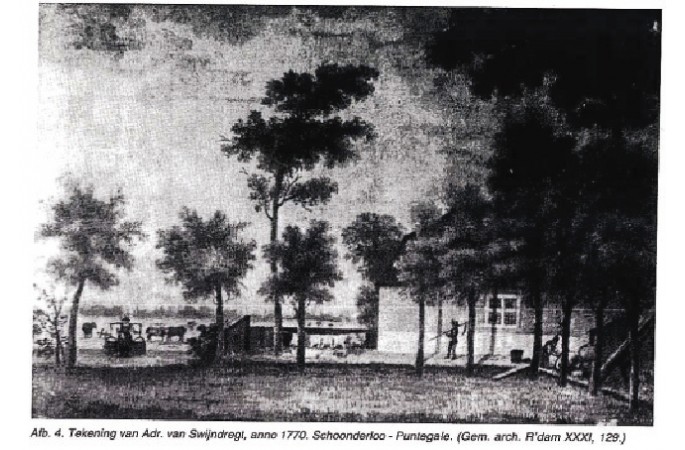 De zeelieden kwamen weer terug in Rotterdam met verhalen over deze plek, maar verbasterde het tot Punt te Gale en uiteindelijk Puntegale. De Puntegale is een welbekend begrip in Rotterdam. De oorsprong van de naam Puntegale (of punte gale) ligt niet vast: er is niet met zekerheid vast te stellen hoe deze plek aan deze naam is gekomen. De naam kan afkomstig zijn van punt de galen, de scherpe hoek in de dijk waarlangs men naar de herberg kwam, maar daarvan is niet gebleken in de beschikbare geschiedkundige naslagwerken. De naam heeft in ieder geval iets te maken met Point de Galle, een haven op Ceijlon waar veel Nederlandse zeelui mee bekend waren, aangezien de VOC daar een fort bouwde. Het kan een verbastering zijn van die naam. In die haven, die gelegen was in het zuidoosten van Ceijlon (nu: Sri Lanka), was een landpunt met de naam Punta Galla. Nederlanders verbasterden die naam en noemden die landpunt Puntegale. Het was een kleine maar veilige haven met een enge mond. Zoals ook nu nog in havensteden het geval is, is de toenmalige herberg in Nederland waarschijnlijk naar dat verre oord genoemd, met de bedoeling klandizie aan te trekken. Per slot van rekening was deze eenzame herberg in Schoonderloo ook een ‘kleine maar veilige haven, met een enge mond’. De zeelieden kwamen weer terug in Rotterdam met verhalen over deze plek, maar verbasterde het tot Punt te Gale en uiteindelijk Puntegale.